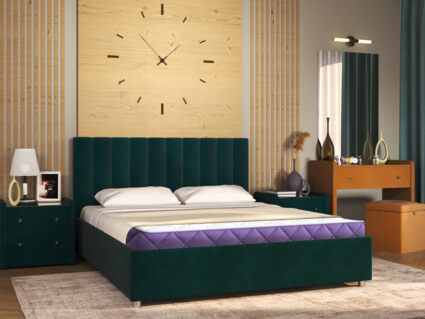 Модель отличается лаконичным изголовьем, которое украшает вертикальная параллельная стёжка. Стильная модель выделяется продуманным дизайном и украсит любой интерьер. Обивка кровати изготовлена из мягкого велюра. Короб производится из ДСП. В комплект входит ортопедическое металлическое разборное основание с подъемным механизмом.