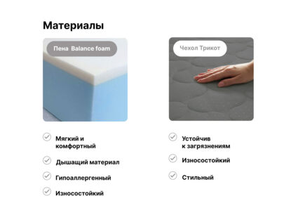 Пена Balance foam – прочный и надёжный наполнитель, который хорошо подстраивается под различные типы фигур и выдерживает частые нагрузки.