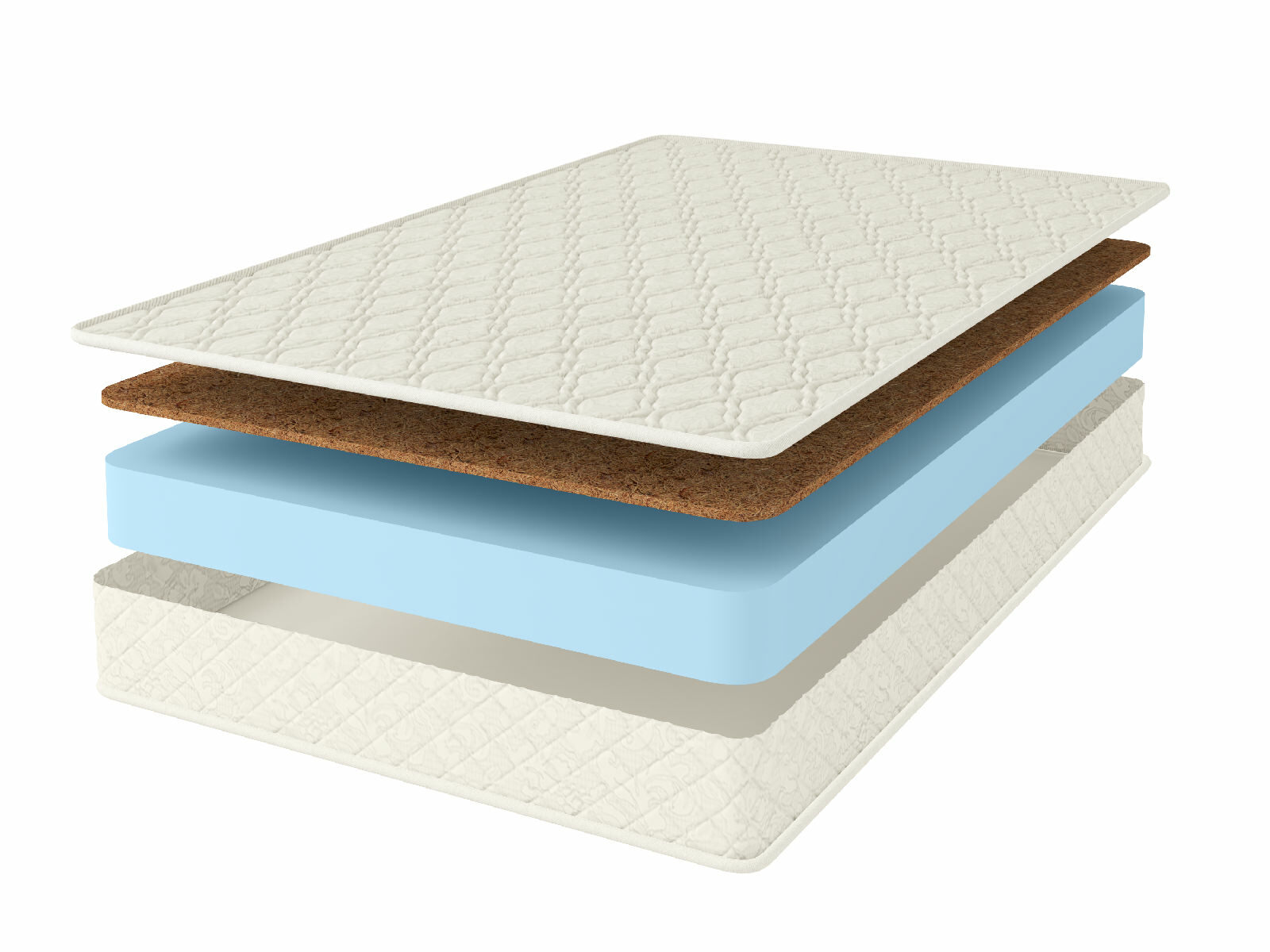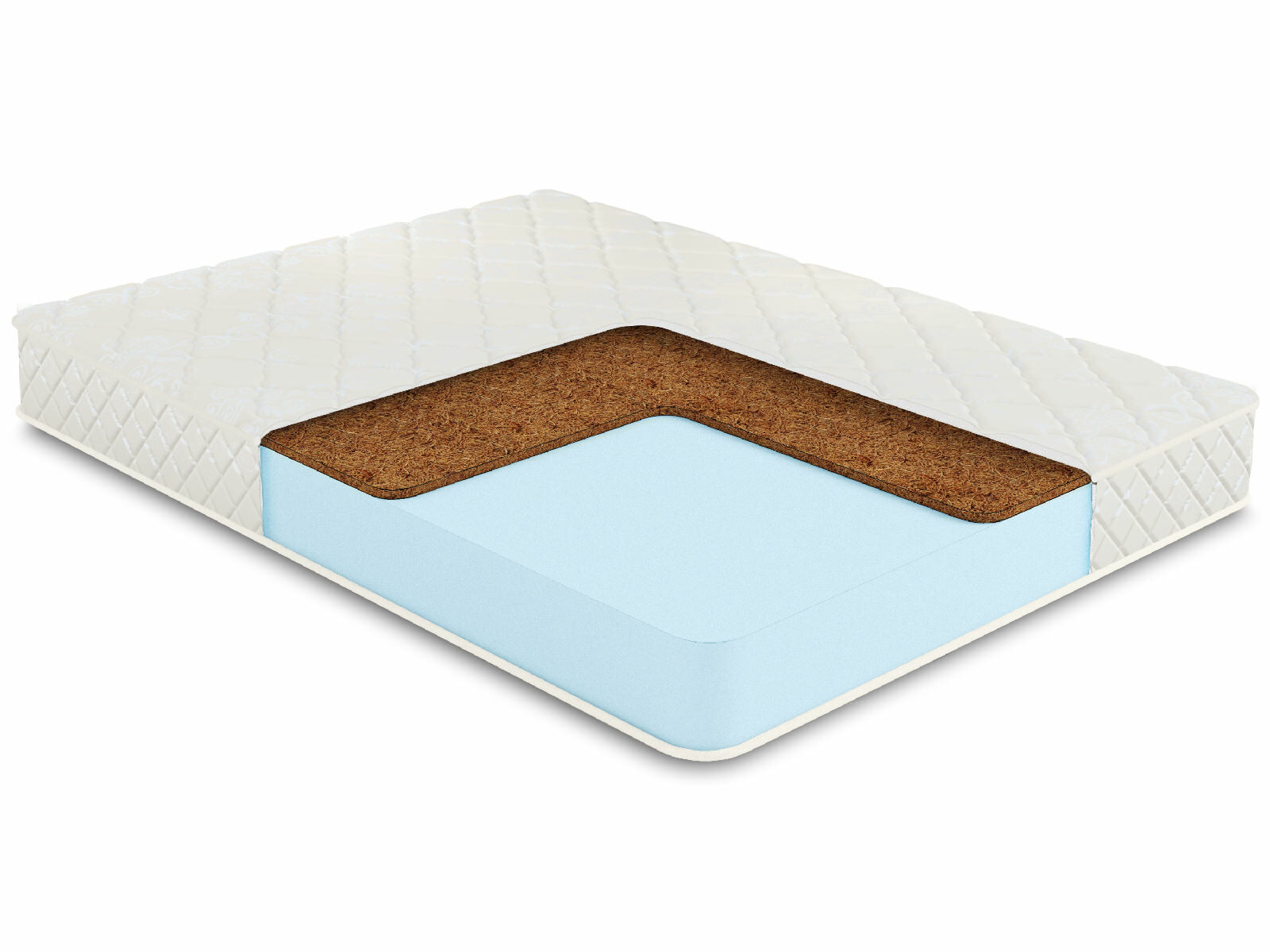 Внутри матрас представлен тонкой плитой кокосовой койры и большим блоком искусственного латекса. Вместе эти наполнители отлично дополняют друг друга. Латекс со своей стороны даёт приятную умеренную мягкость, которой лишен кокос, а койра обеспечивает грамотную поддержку позвоночнику.