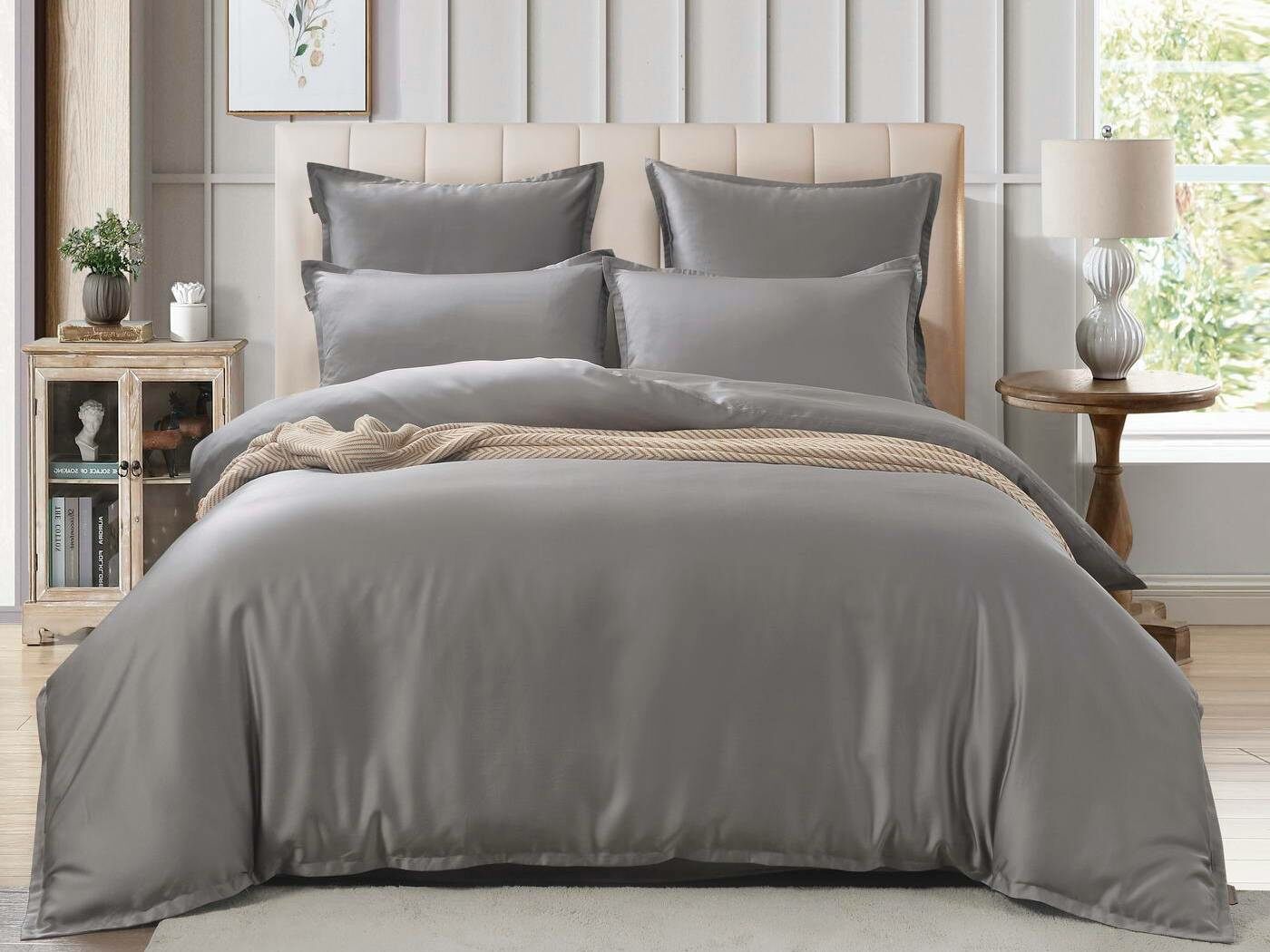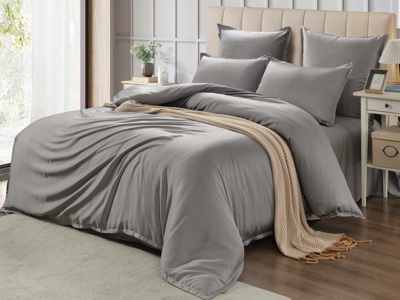 Комплекты постельного белья Ансель: нежность и комфорт каждую ночь Ищете постельное бельё, которое подарит вам незабываемый комфорт и уют? Тогда комплекты постельного белья Ансель из тенселя — идеальный выбор! Тенсель — это натуральная ткань, изготовленная из волокон эвкалипта. Она обладает рядом преимуществ перед хлопковыми тканями: более нежная, шелковистая и приятная на ощупь. Комплекты постельного белья Ансель включают в себя наволочки, простыню и пододеяльник. Они выполнены из 100% тенселя, что гарантирует высокое качество и долговечность. Одно из главных преимуществ тенселя — его способность пропускать воздух и хорошо впитывать и испарять влагу. Это обеспечивает оптимальный микроклимат во время сна, предотвращает появление неприятных запахов и бактерий. Ещё одно важное свойство тенселя — антибактериальный эффект. Это значит, что постельное бельё Ансель не вызывает аллергии и подходит для людей с чувствительной кожей. Уникальное свойство тенселя — климат-контроль. При высокой температуре в помещении ткань обладает лёгким и приятным охлаждающим эффектом, а при низкой создаёт ощущение тепла и комфорта. Комплекты постельного белья Ансель — это идеальный выбор для тех, кто ценит комфорт, качество и натуральность. Они станут отличным дополнением к вашему интерьеру и подарят вам незабываемые ощущения во время сна.