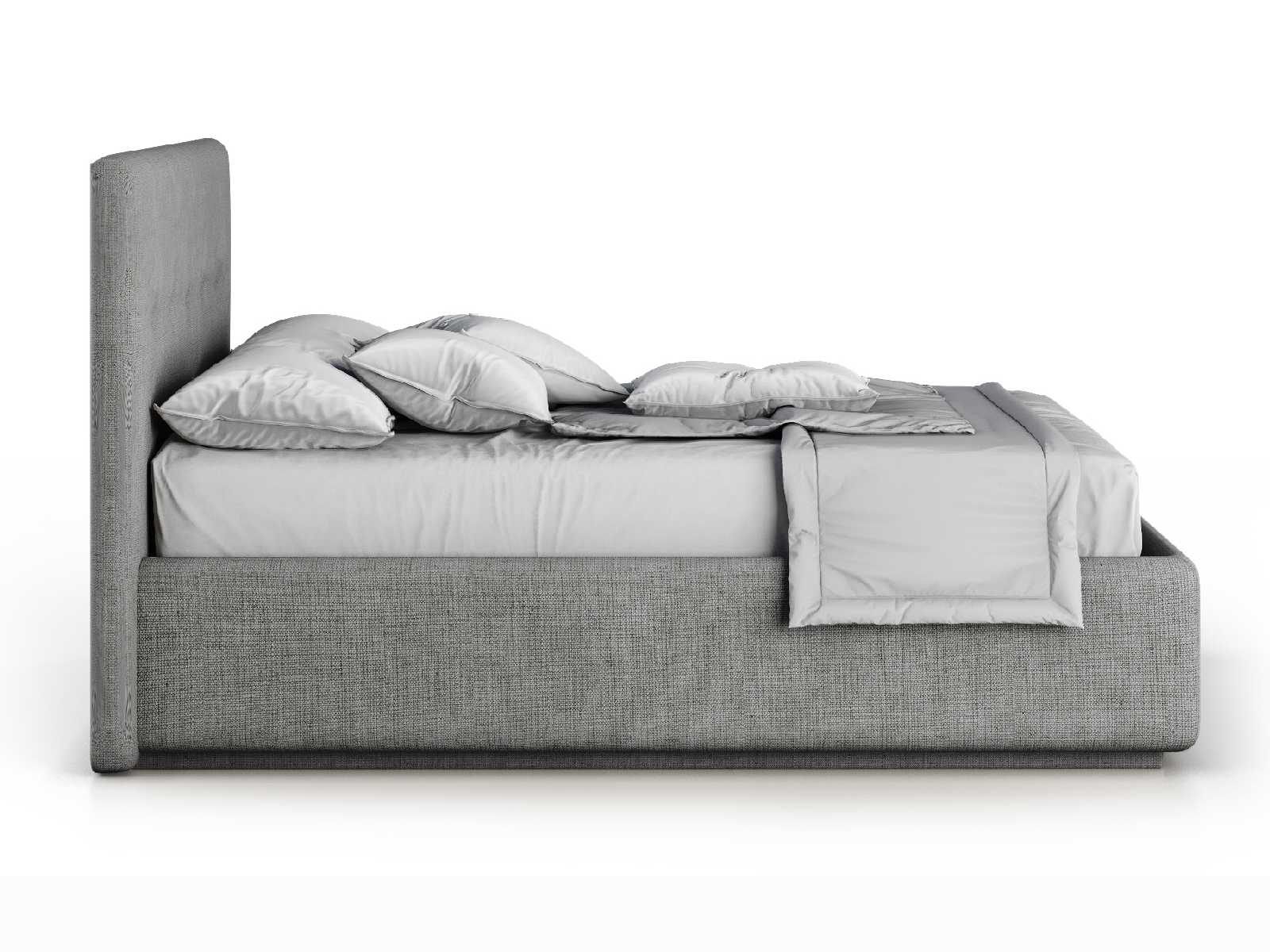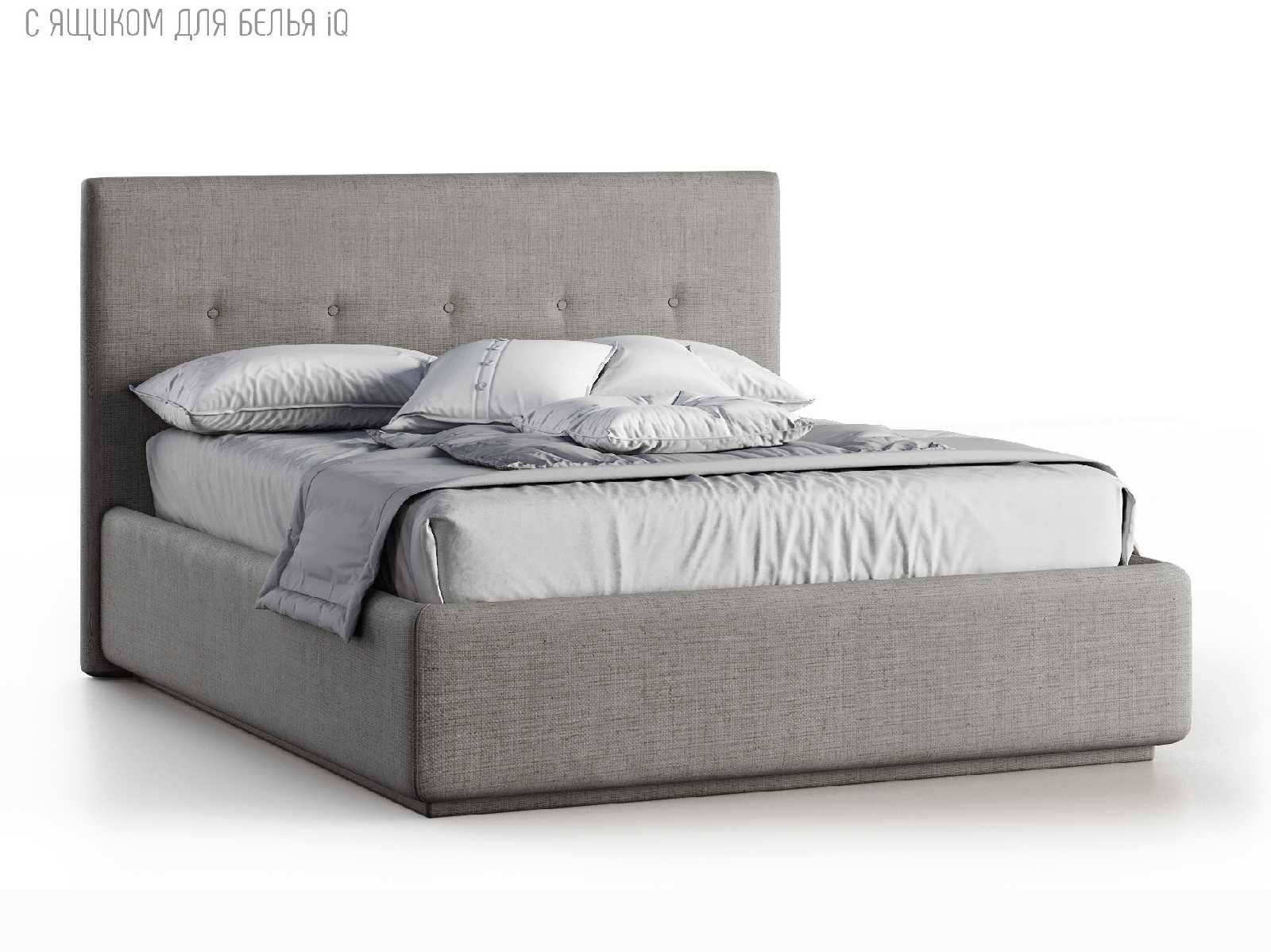 Кровать укомплектована IQ с подъемным механизмом и ящиком для белья без дна (дополнительная платная опция - дно к ящику IQ из HDF (ХДФ). Каркас кровати на цоколе, декоративный чехол на цоколе съёмный. Глубина ящика для белья - 30 см, без ограничения нагрузки на ящик.