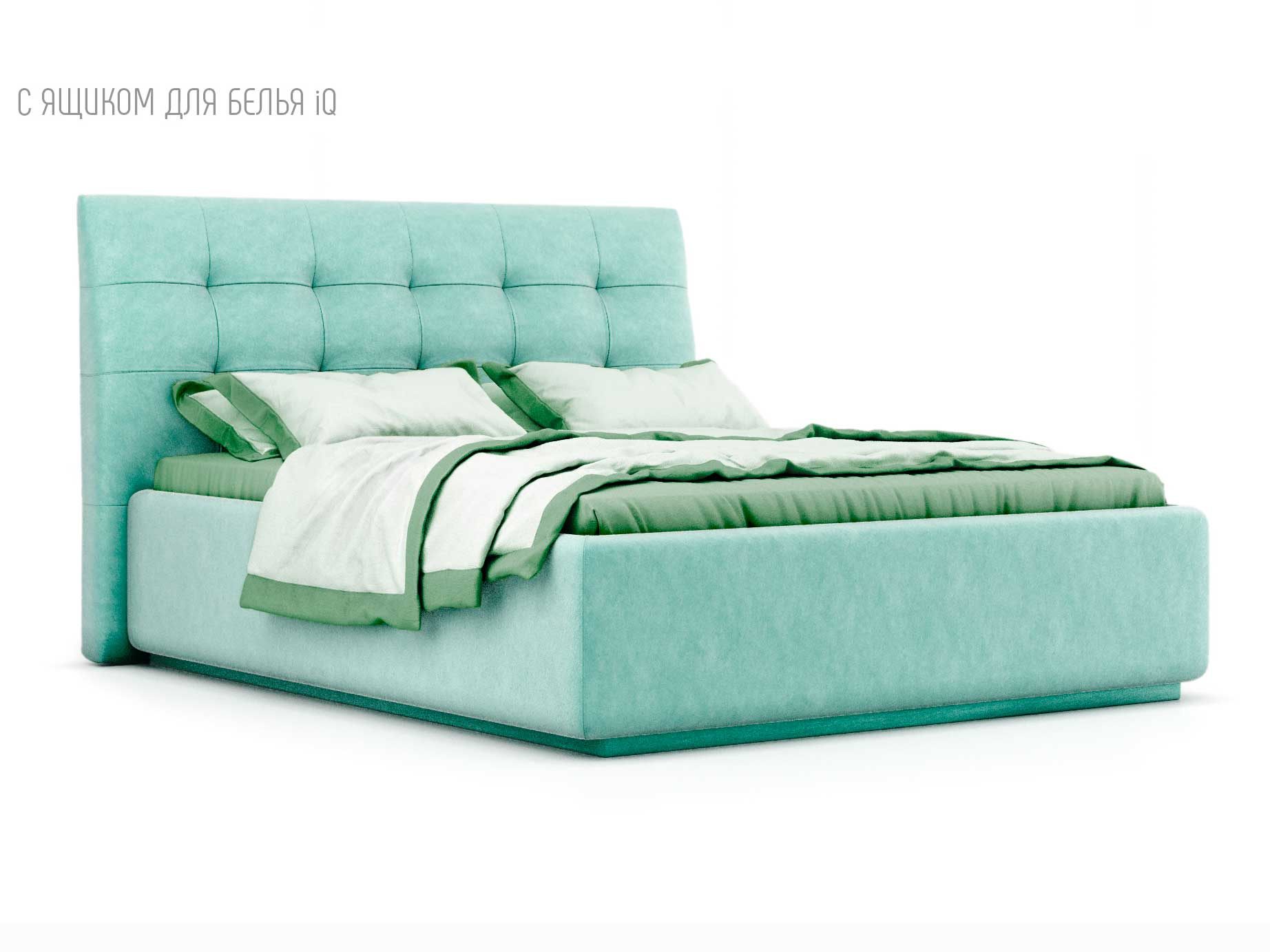 Кровать укомплектована IQ с подъемным механизмом и ящиком для белья без дна (дополнительная платная опция - дно к ящику IQ из HDF (ХДФ). Каркас кровати на цоколе, декоративный чехол на цоколе съёмный. Глубина ящика для белья - 30 см, без ограничения нагрузки на ящик.