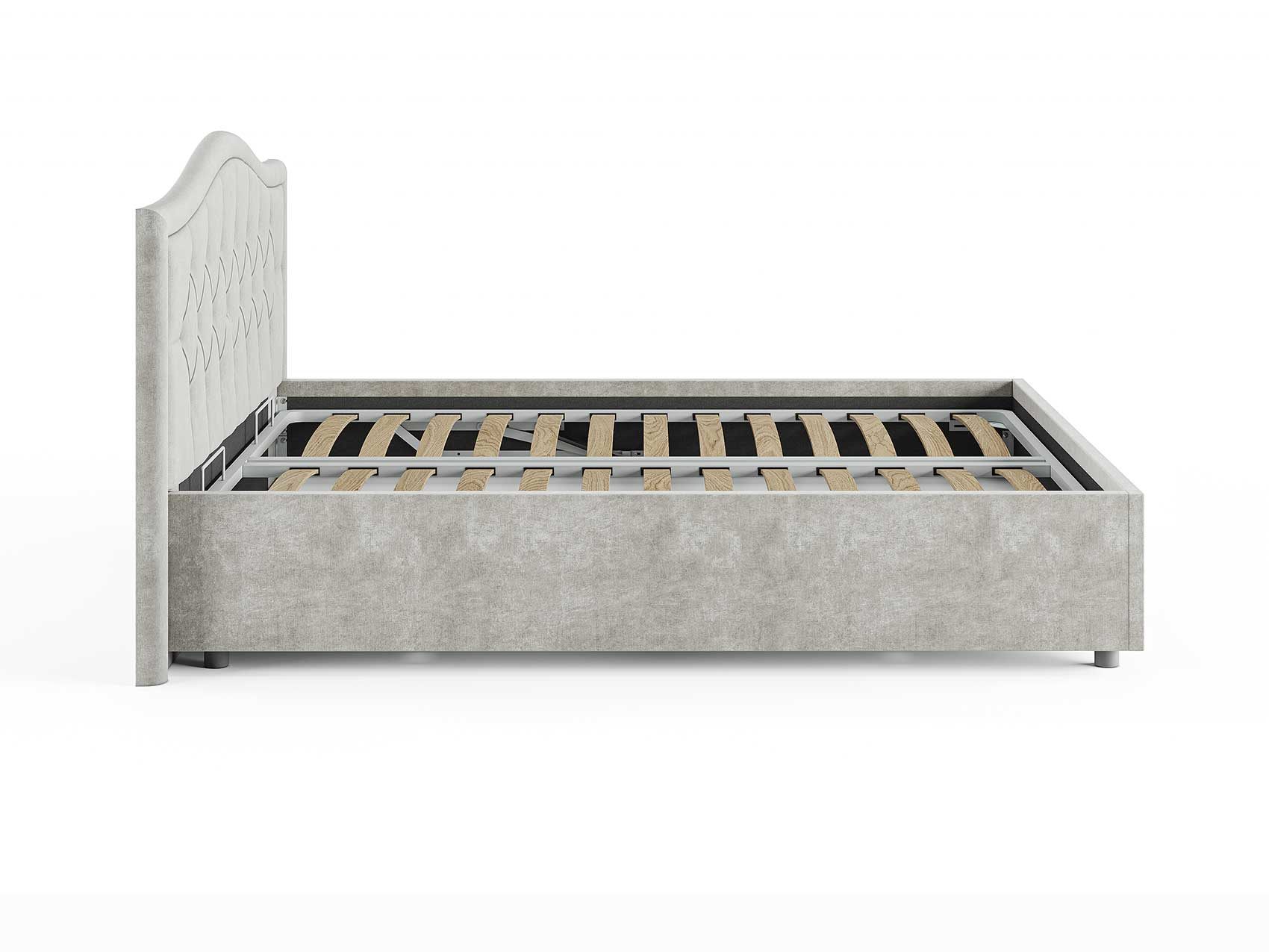 Кровать комплектуется металлическим основанием и подъемным механизмом со вместительным бельевым ящиком. Дно бельевого ящика легко сдвигается для обеспечения уборки под кроватью.