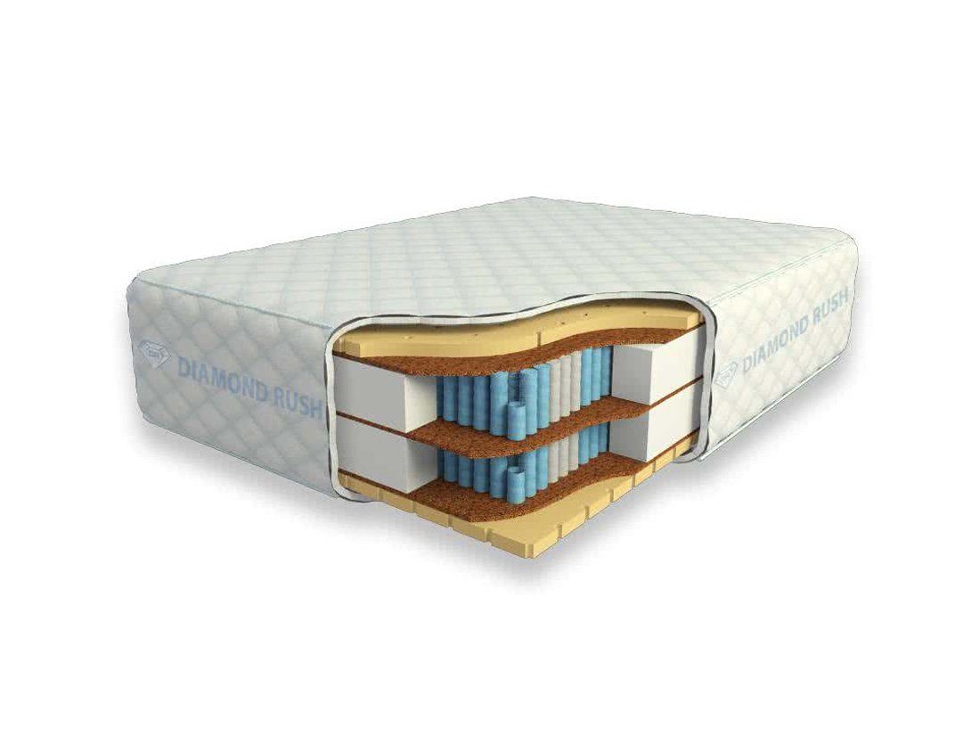 Матрас из серии Luxury Diamond имеет в своей основе двухъярусный независимый пружинный блок MultiZone, состоящий из пружин диаметром 3-4 см разной жесткости. В качестве настилочных слоев поверх пружинных блоков используются листы латексированной кокосовой койры в сочетании с натуральным перфорированным латексом. Стороны имеют одинаковую среднюю жесткость.