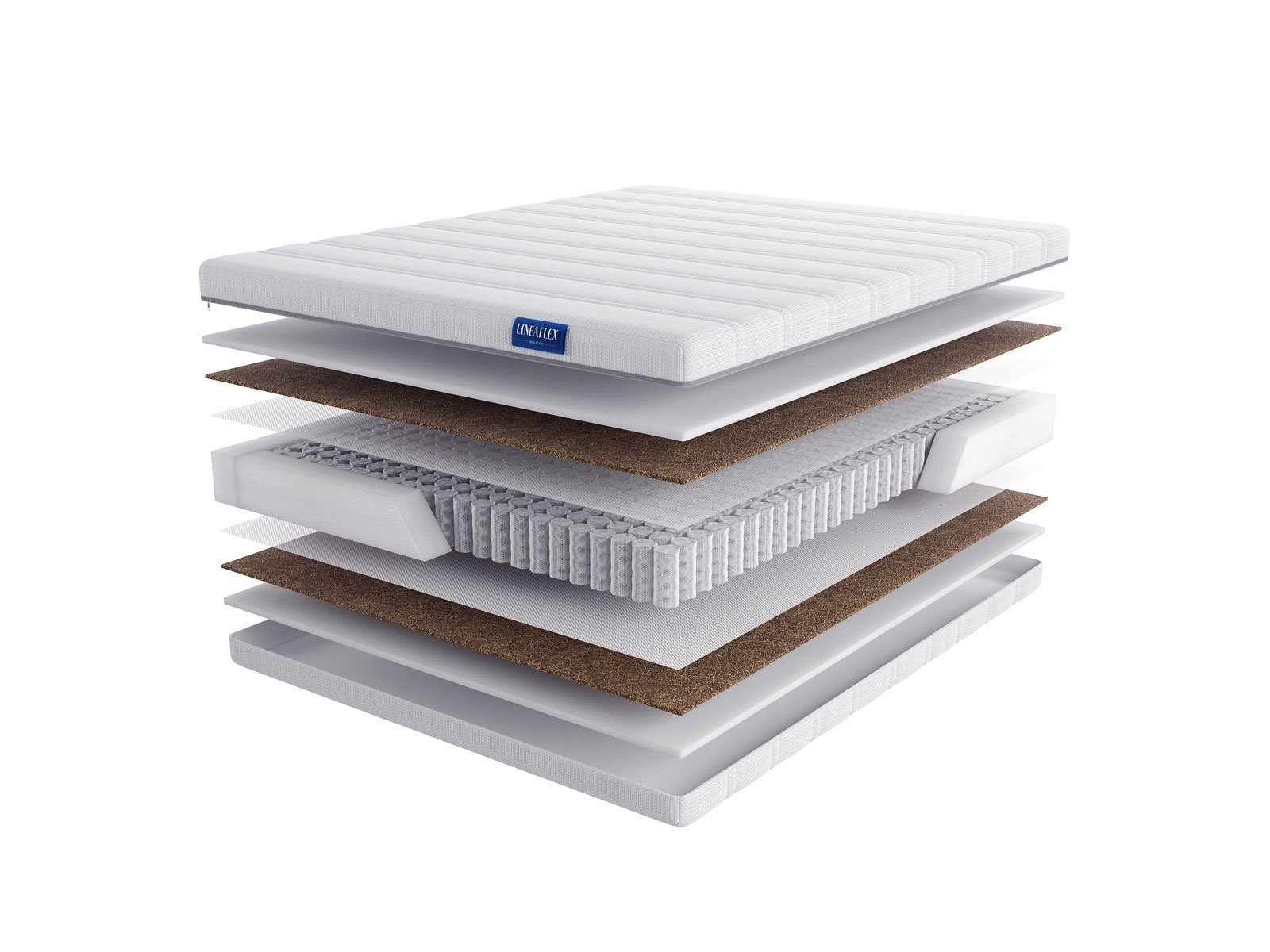 По сторонам от пружин расположились настилы наполнителей. Первой установлена койра кокоса, а уже над ней проложена пена Ergoflex. Такой порядок слоёв обеспечивает, с одной стороны, качественную поддержку для спины – за неё отвечает твёрдый пласт кокоса, а с другой – даёт комфортный отдых. Мягкая пена нивелирует излишнюю жёсткость нижнего слоя и формирует способность матраса к подстройке под анатомию человека.