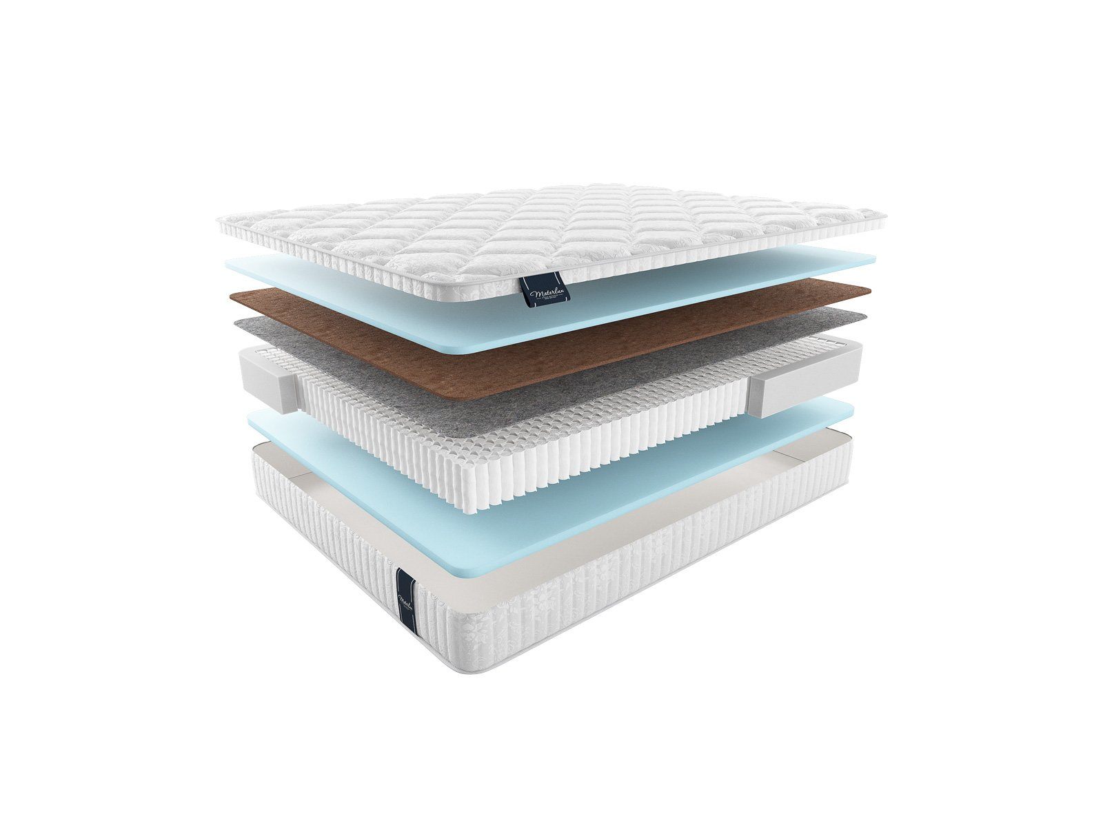 Первая сторона матраса укомплектована плотной и эластичной универсальной пеной natural foam (аналог натурального латекса) в комбинации с латексированным кокосом и термофиксированным фетром. Матрас ощущается плотным и устойчивым. Вторая сторона состоит из более плотной пены natural foam, благодаря которой увеличивается износостойкость матраса, а поверхность ощущается жестче. Для дополнительного комфорта матрас усилен каркасом 10 см по периметру, что дает ряд дополнительных преимуществ: он прекрасно держит вес, хорошо восстанавливается после нагрузки, а срок его службы становится больше.