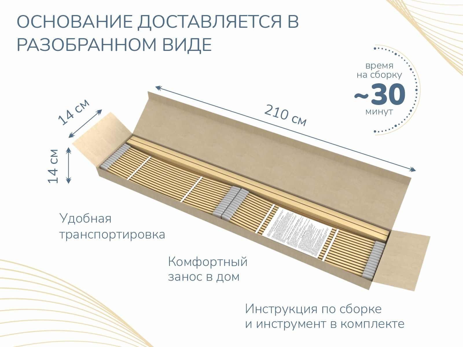 Основание для матраса - клееная фанера из березы сечением 50х25мм. Идеально подходит для матрасов на независимом пружинном блоке, так как благодаря небольшому(около 3 см) расстоянию между латофлексами, не допускается проседание пружин в блоке. Высота ножек может быть любой по желанию клиента.