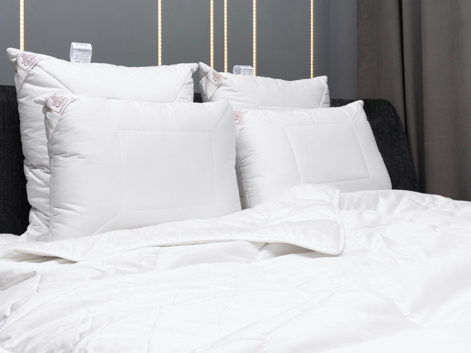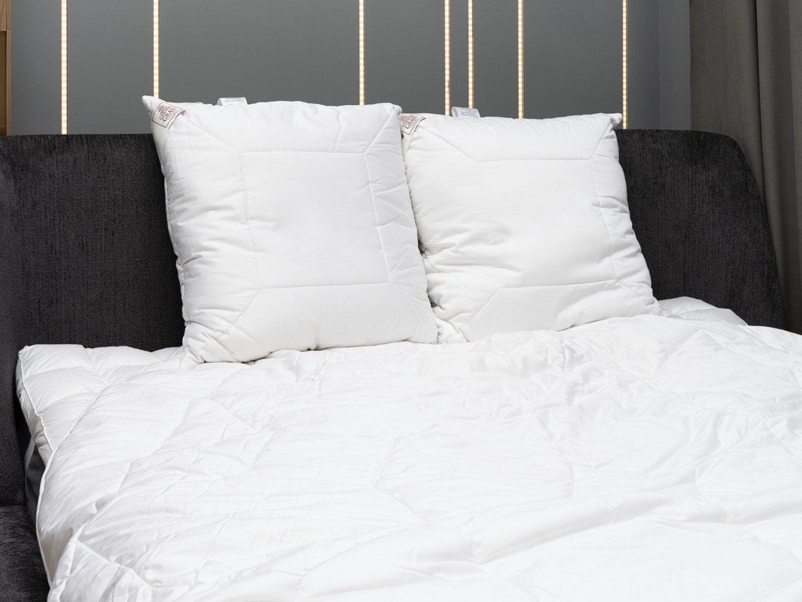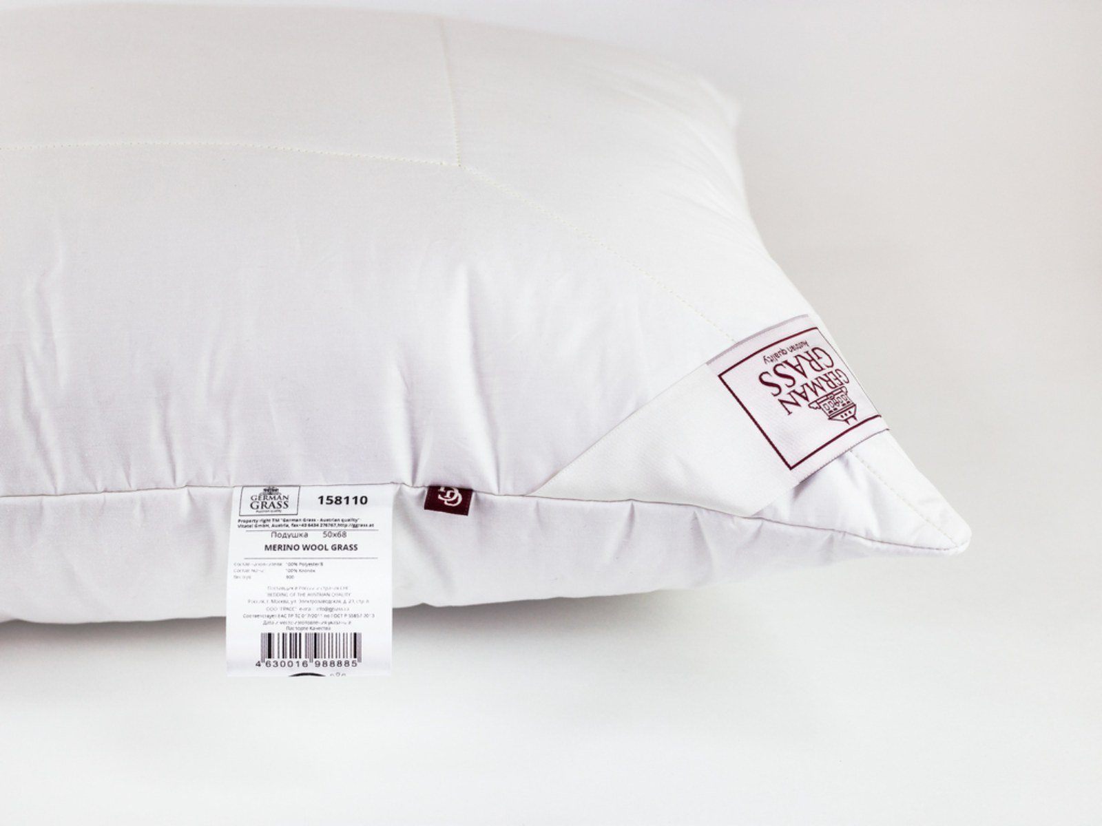 Чехол: сатин пуходержащий (Fine sateen), 100% cotton (хлопок); наполнитель в чехле - шерсть мериноса (100% MERINO GRASS®), термоскрепленная высокосиликонизированным би-компонентом. Цвет - белый. Плетение нитей Nm 160/133 TC 350.