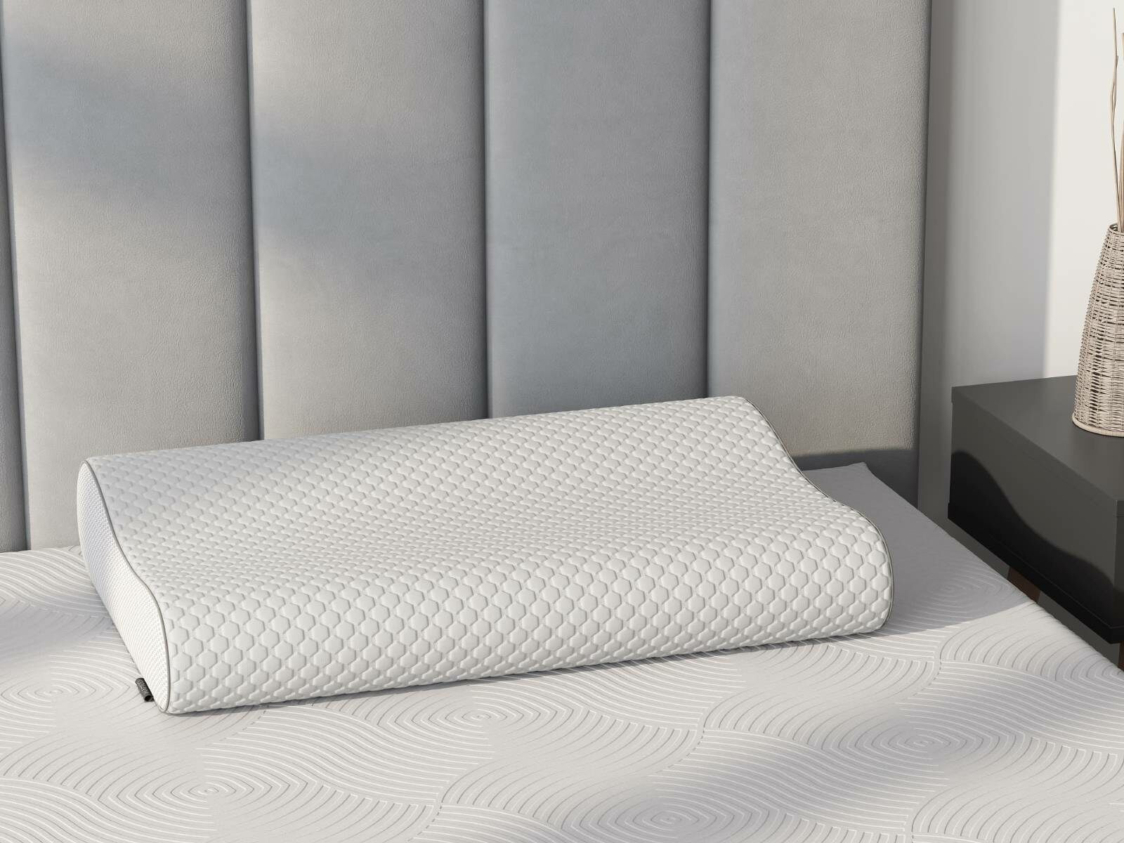Ортопедическая подушка memory foam изготовлена из инновационного материала NeoTaktile с эффектом памяти. Принимает форму головы и идеально поддерживает шейный отдел позвоночника. За счет гранул охлаждающего геля обладающих эффектом терморегуляции, ортопедическая подушка Delta мемори пропускают и охлаждает воздух.