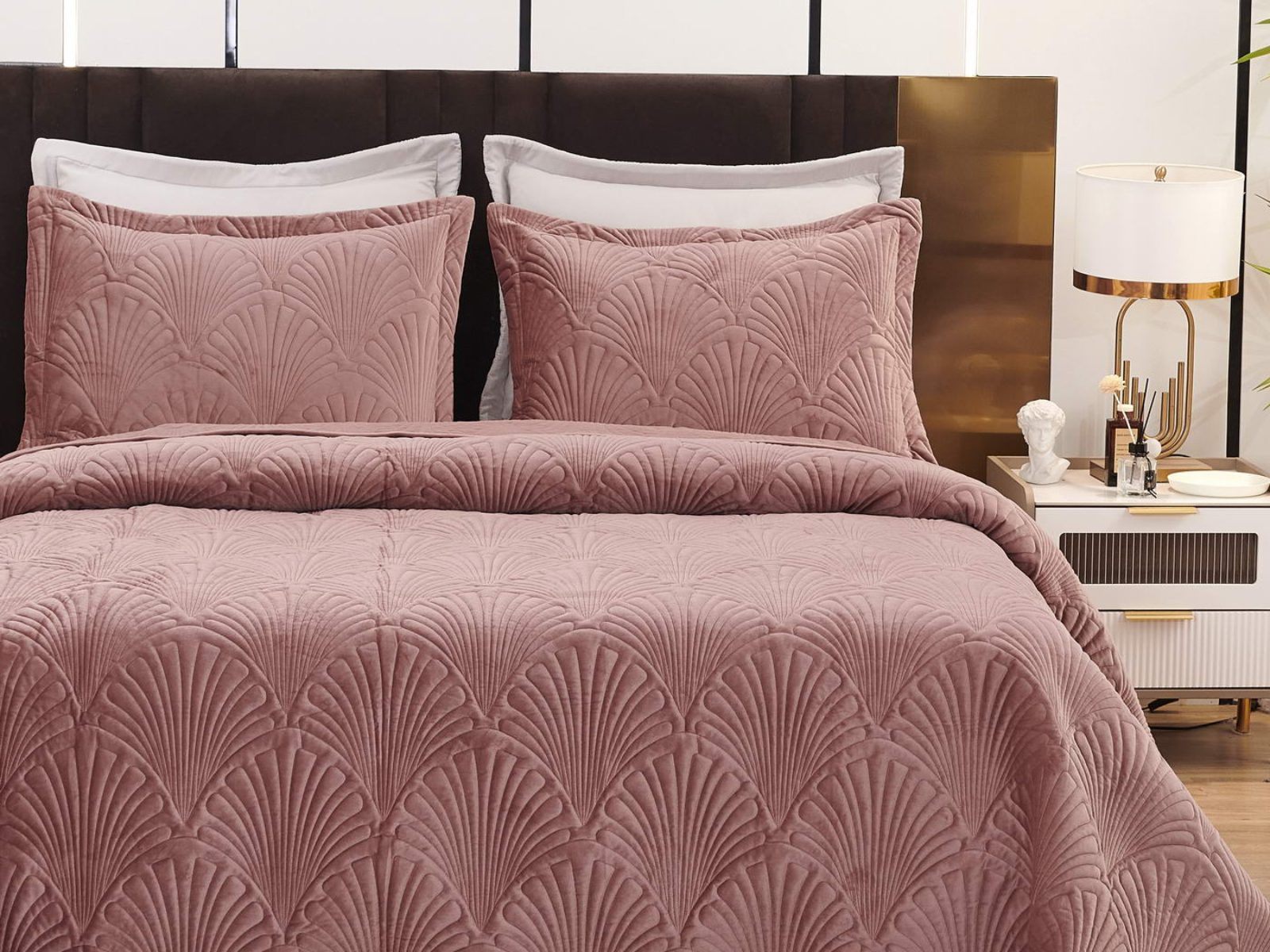Роскошное велюровое покрывало Ариэль станет изюминкой любого интерьера, ведь оно потрясающе выглядит и приятное на ощупь. Обратите внимание на стежку покрывала – она выполнена в виде ракушек с эффектом 3D. Из-за особого плетения, велюровая ткань покрывала отражает свет и красиво переливается при различном освещении.