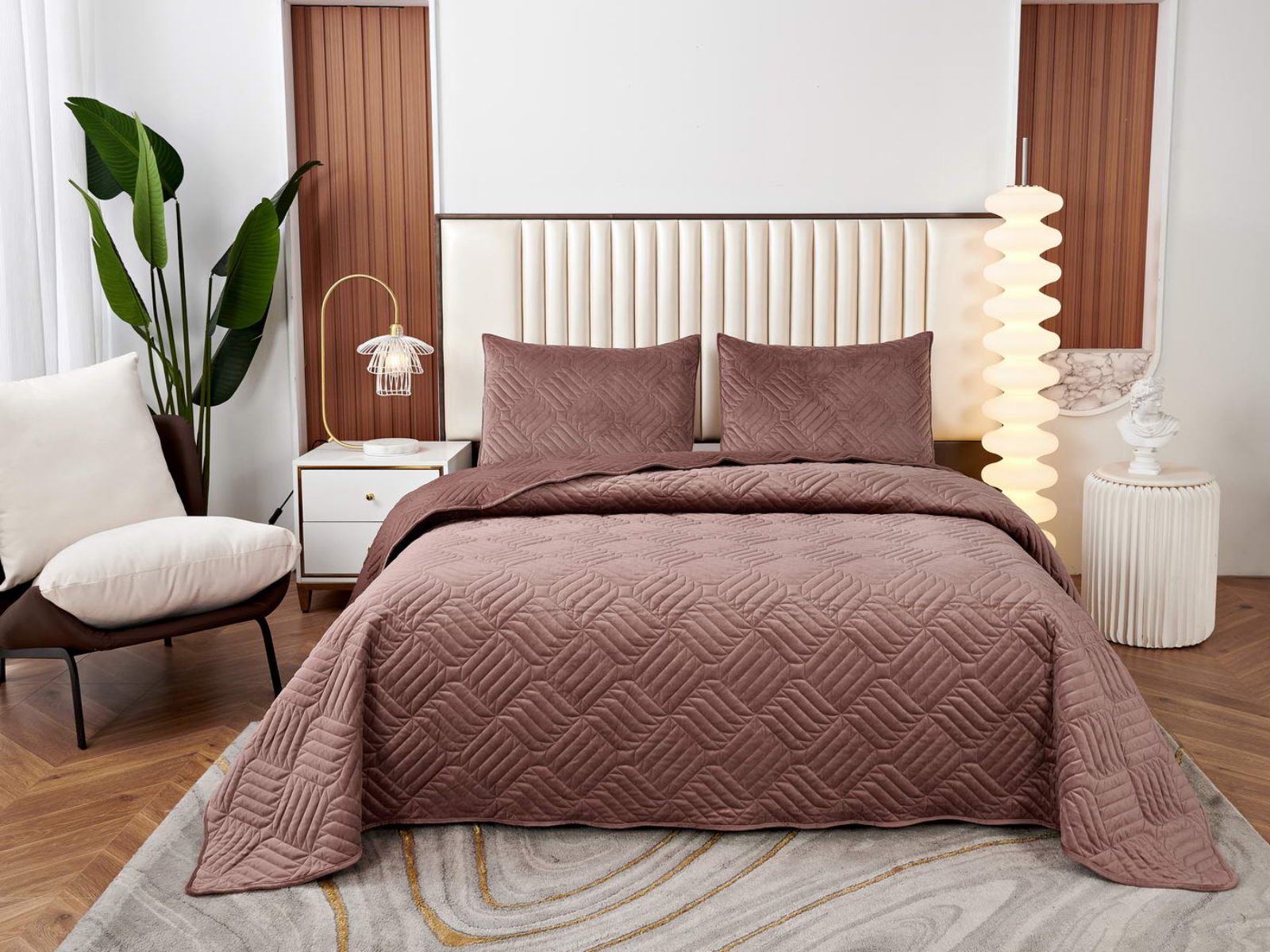 Покрывала выполнены в 10 оттенках: крем, мокко, пепельный, песочный, светло-бежевый, светло-серый, серый, темно-серый, чайная роза и черный. Стежка в виде геометрического орнамента подойдет к любому современному интерьеру. Из-за особого плетения, велюровая ткань покрывала отражает свет и красиво переливается при различном освещении.