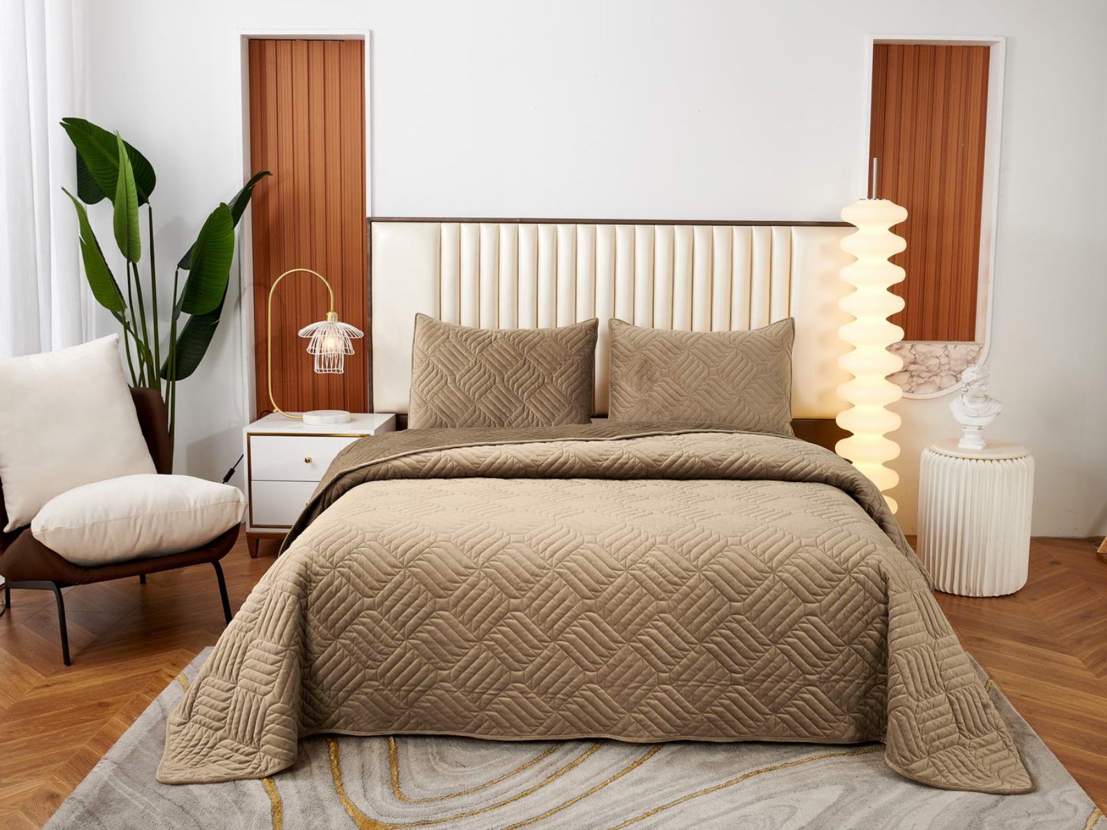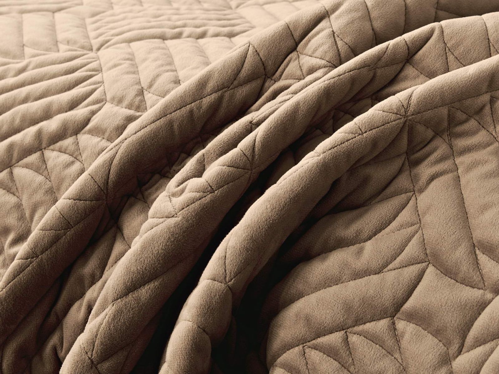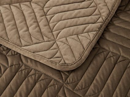 Покрывала выполнены в 10 оттенках: крем, мокко, пепельный, песочный, светло-бежевый, светло-серый, серый, темно-серый, чайная роза и черный. Стежка в виде геометрического орнамента подойдет к любому современному интерьеру. Из-за особого плетения, велюровая ткань покрывала отражает свет и красиво переливается при различном освещении.