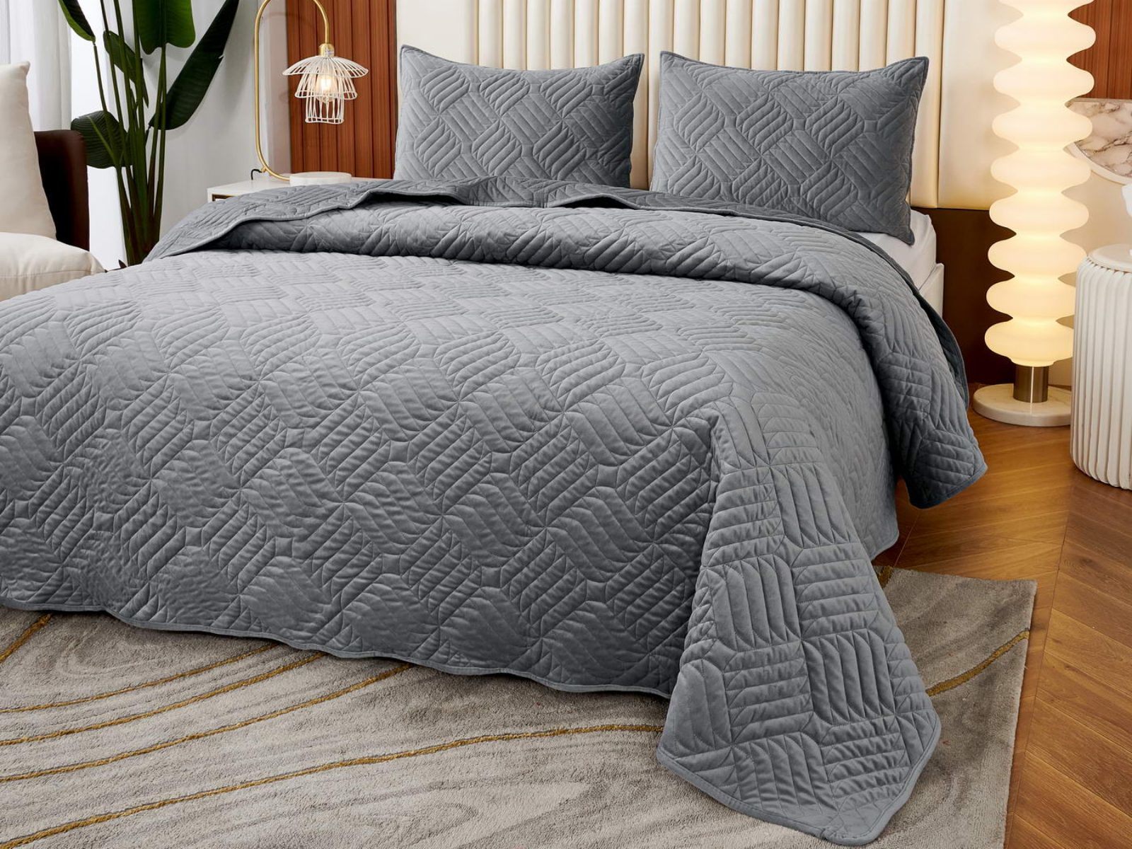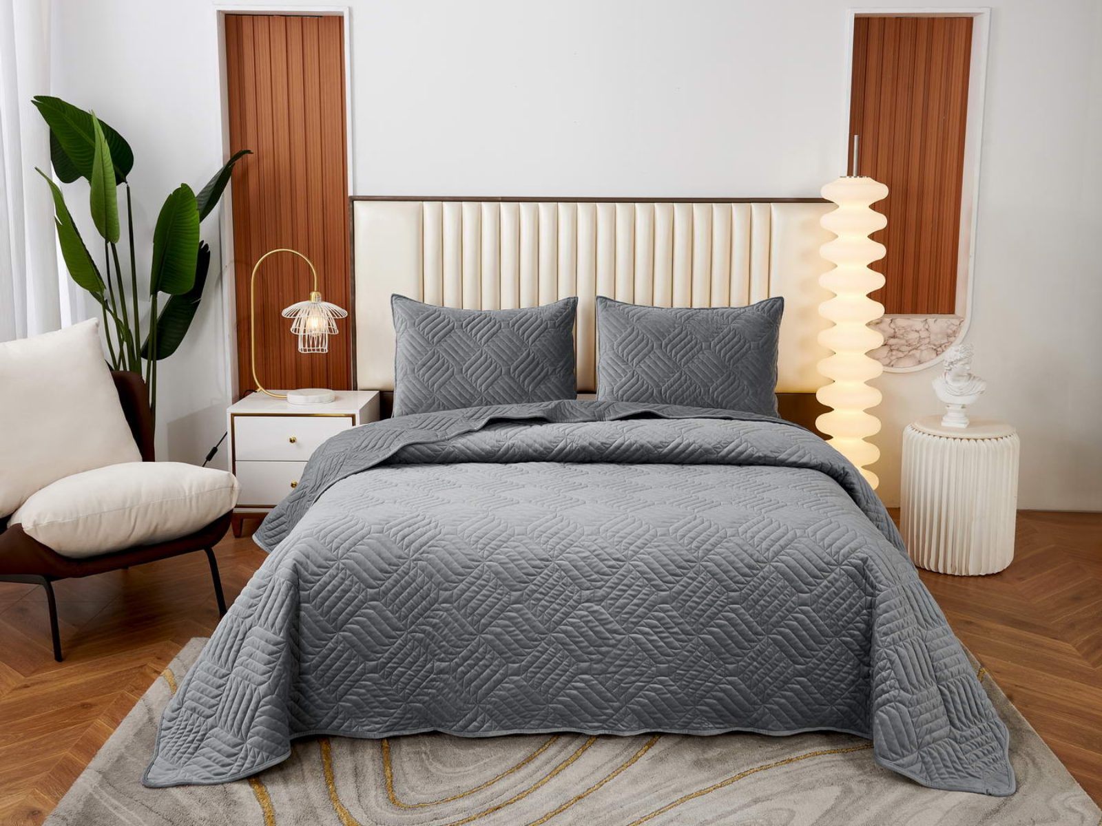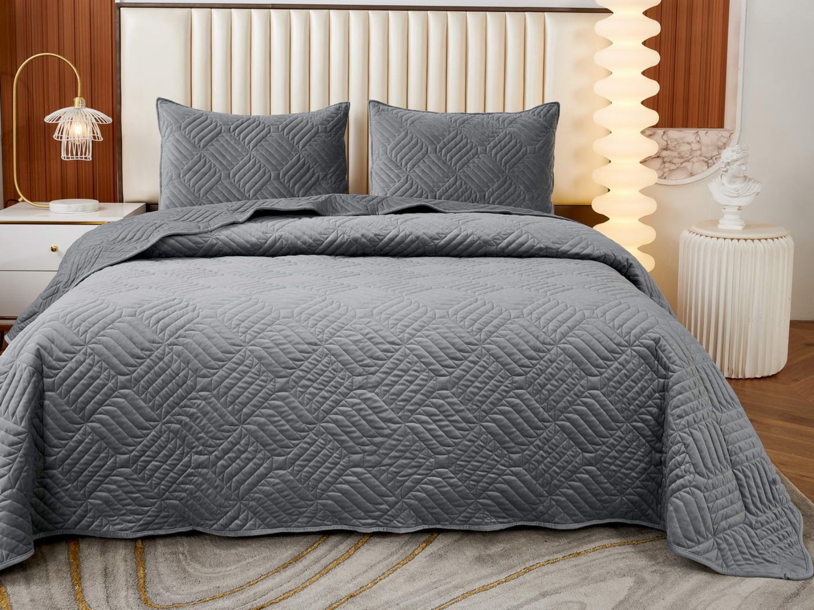 В комплект входят покрывало и одна либо две наволочки (50х70 см) из аналогичного материала в зависимости от размера. Каждый набор заботливо упакован в фирменную подарочную сумку.Покрывало стеганое с графическим узором. Пошив покрывала с кантом, наволочки на запахе, декорированы ушками 5 см.