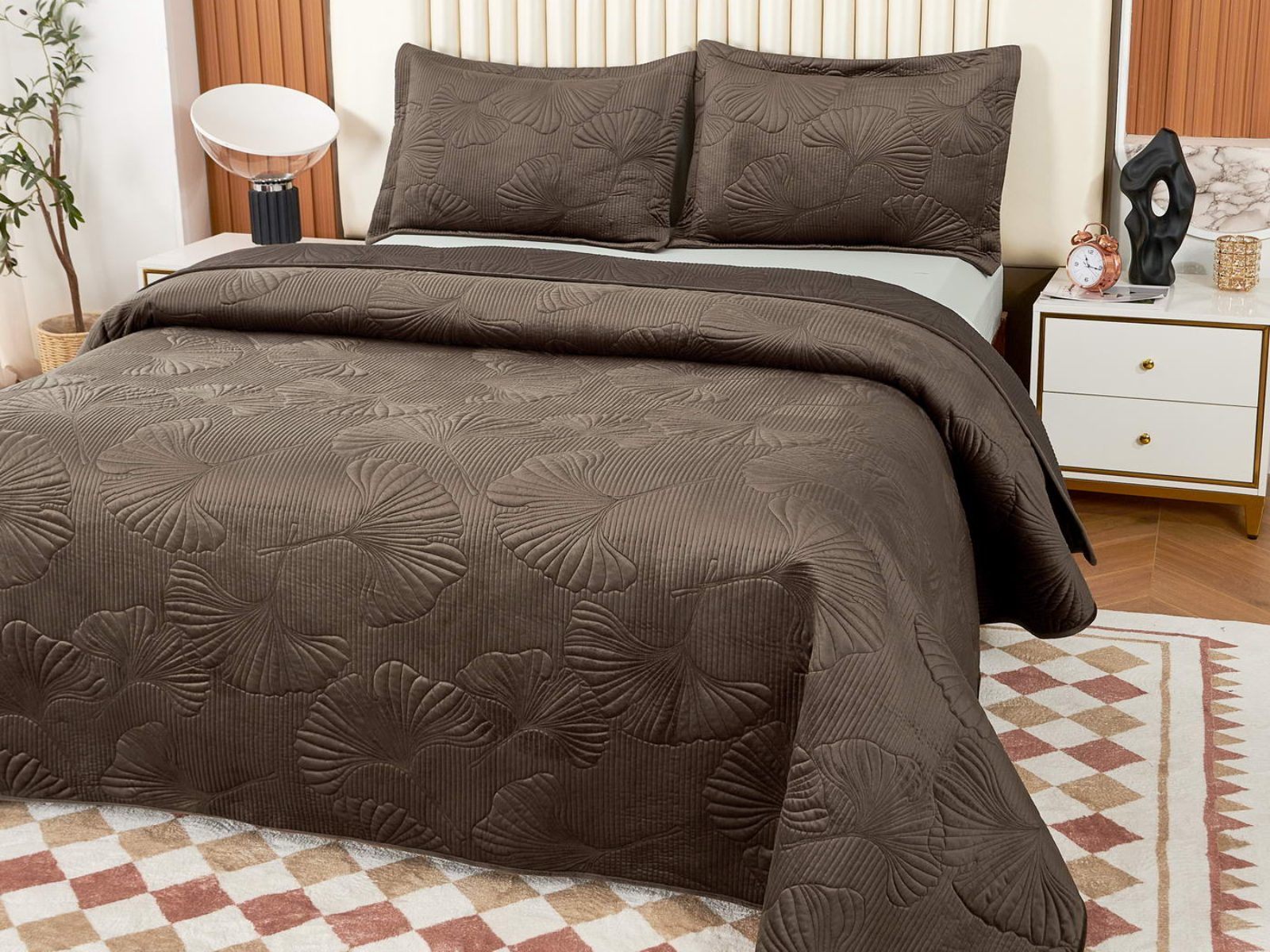 Роскошный растительный орнамент в виде вышивки добавит Вашей спальне элегантности и изысканности. Текстура цветочного узора будет сочетаться с другими элементами интерьера, такими как шторы, подушки, ковры и т.д.