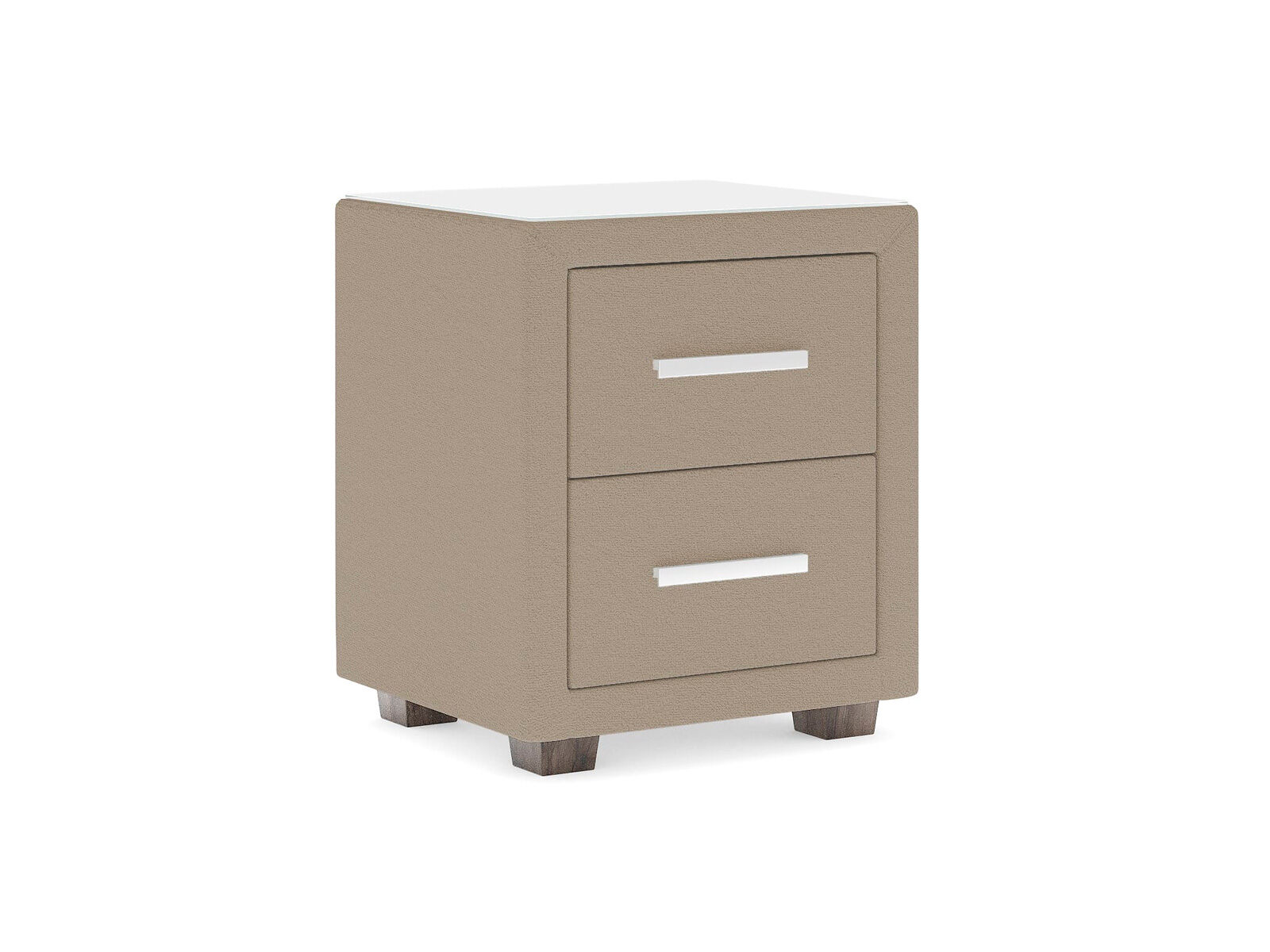 Прикроватная тумба с двумя выдвижными ящиками сочетается с любыми моделями кроватей, органично вписывается в интерьер практически любого стиля. Каркас тумбы выполнен из ДСП. Каркас тумбы и фасад ящиков покрыты обивочным материалом. Для удобства использования и продления срока эксплуатации, рекомендуется использовать стеклянную накладку. Накладка используется в качестве столешницы для тумбы и защищает ее от повреждений и загрязнений. Стеклянная столешница заказывается дополнительно.