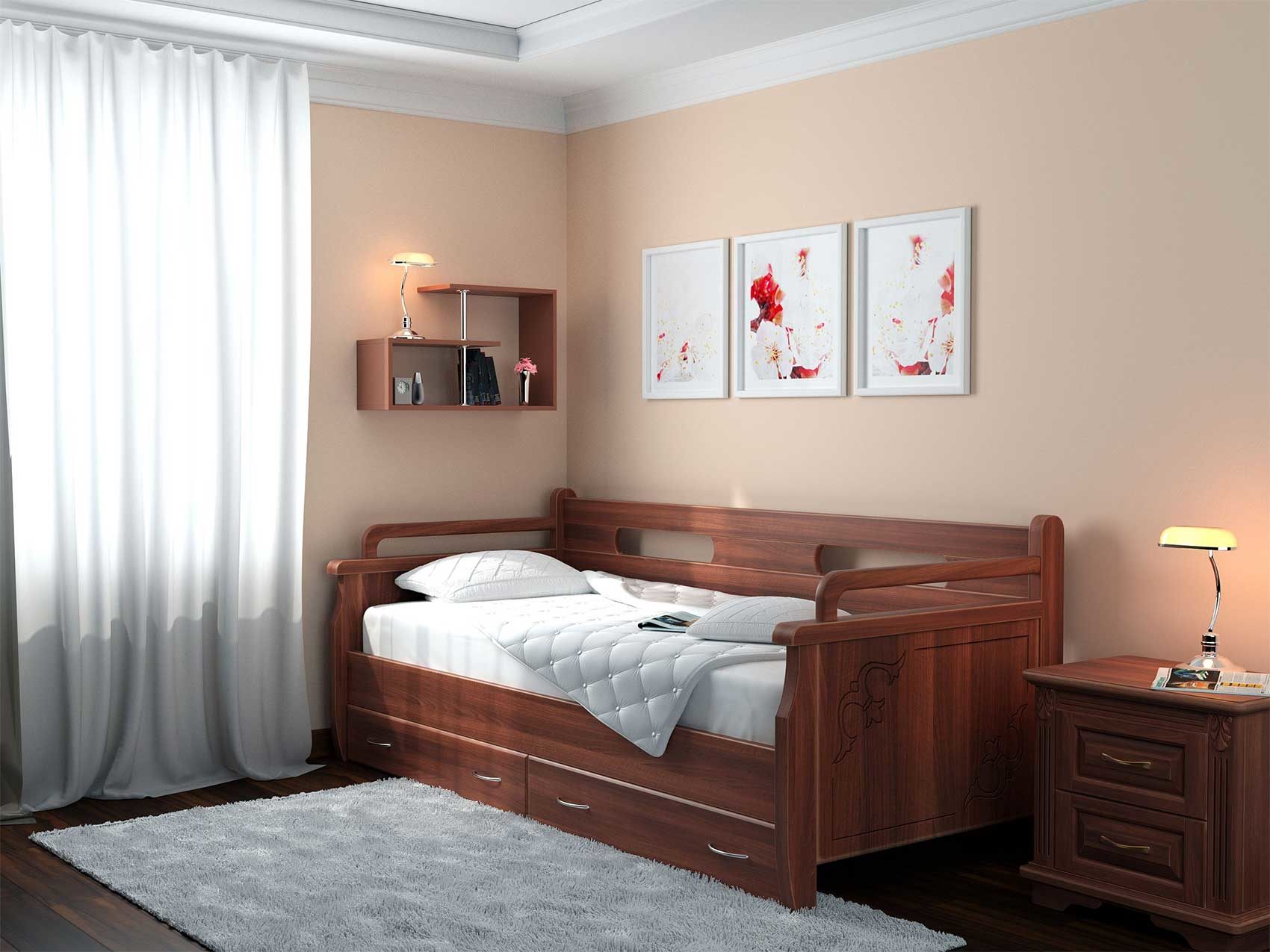 Живая классика для Вашего интерьера. Как и у всех моделей кроватей практичность и универсальность кровати, возможность комплектования как выкатными ящиками, так и ящиком для белья из массива или ЛДСП с подъемным механизмом фронтального или бокового открытия являются неоспоримыми преимуществами этой модели. Стандартно не комплектуется выкатными ящиками, ящики заказываются и оплачиваются отдельно Задняя спинка — 85 см., боковые поручни — 75 см.